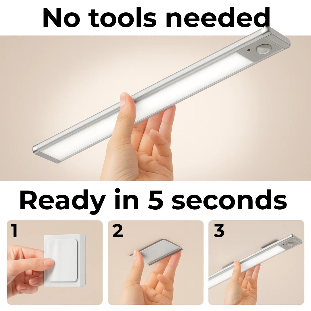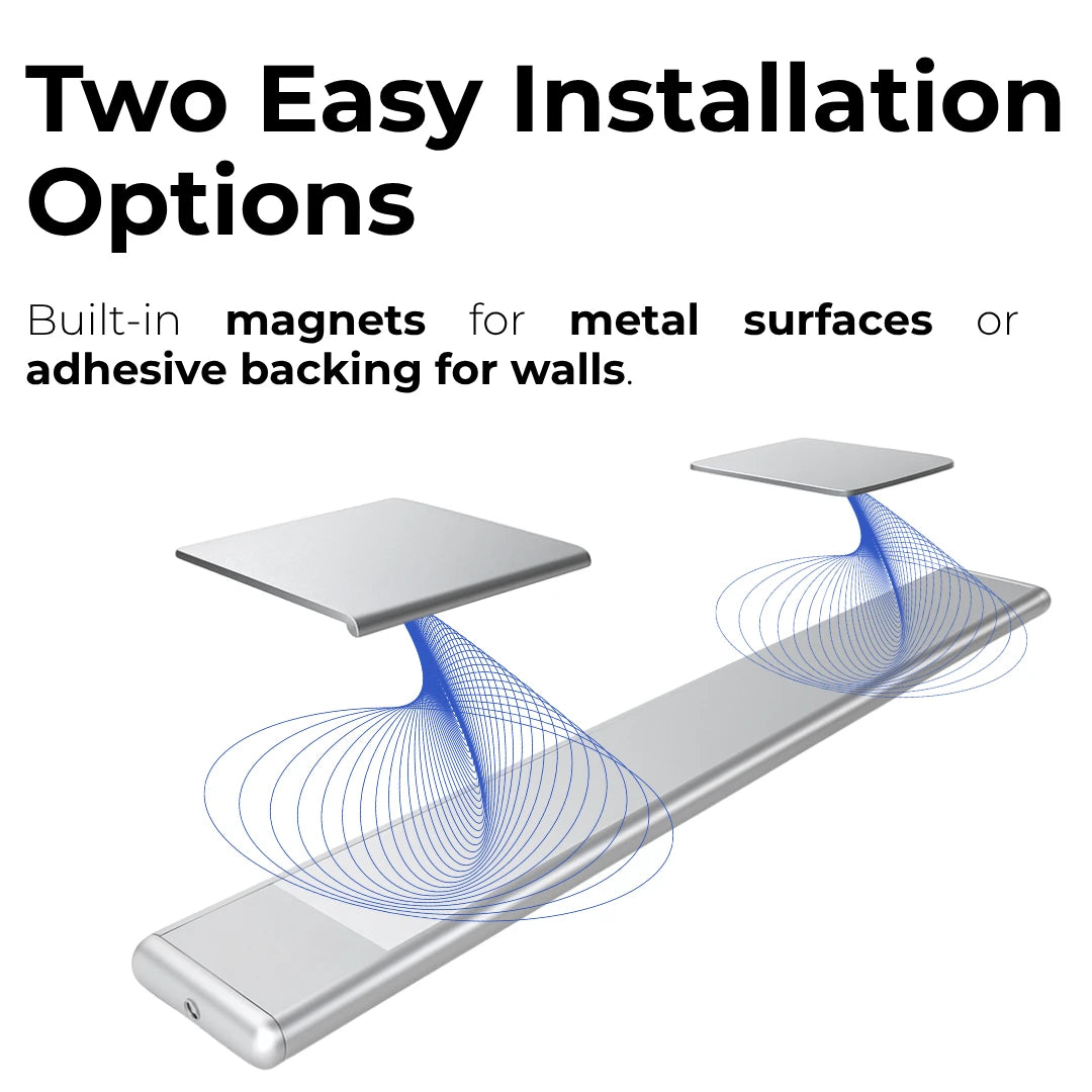 Installation is tool-free and takes seconds. Simply peel the backing from the adhesive metal plate, stick it to any surface, and the magnetic light will snap right on. It's completely damage-free.